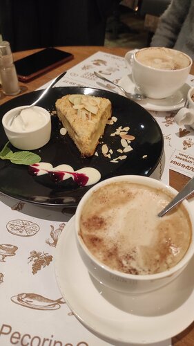 Тесновато, и это с учётом выходного дня. Выбор блюд большой, но всего понемножку. В час дня паста ещё была, а в два уже нет. На витрине всё холодное, греют в микроволновке, брал лазанью и овощи гриль с киноа, почемуто положили на одно блюдо, лазанья внутри не прогрелась, только снаружи. "Бариста" вообще не понятно кому заказы отдаëт. Взяли два капучино, 400 и 300 мл. Покушали, пошëл забирать заказ, оказалось, что готовит он их по отдельности и выдаëт в зал также, а мой средний уже кому-то отдал... Общее впечатление на троечку. Ценник, за полуфабрикат, который тебе недогрели в микроволновке - великоват.