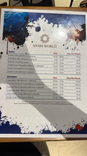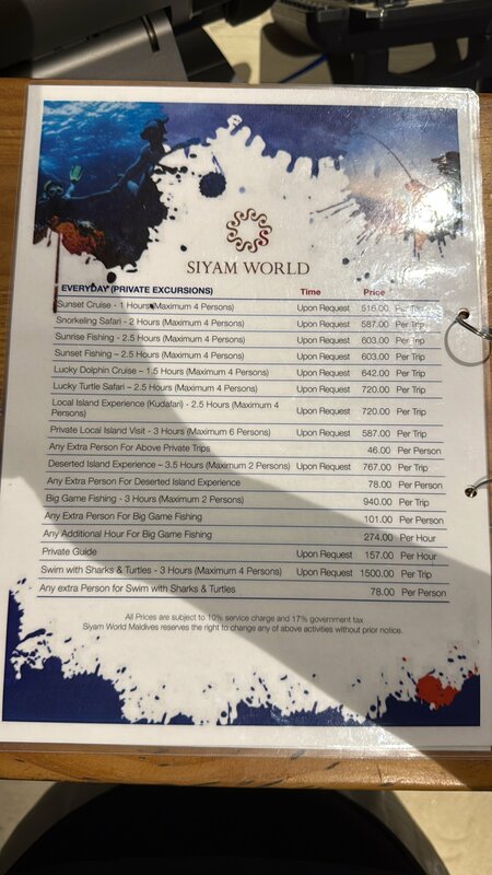 Рай…. Прекрасный отель. Пляжная вилла. Огромный остров - не знаю даже это + или -… Лететь от аэропорта Мале на самолетике- вообщем встречают с табличкой, проводят к регистрации , взвешивают багаж и забирают (если переодеться имейте ввиду!) - народу много , суета и духота. Потом вы проходите в терминал местного аэропорта вн рейсов там зал ожидания. Можно сделать массаж воротниковой зоны, небольшая игровая с сухим бассейном и шариками , раскраски и книги, мультик по телеку. Есть душевая, еда кошмар но если оч голодный что то схватить можно. Алко не заметили. Кофе бяяя Полет 45 мин . Берегите беруши!!! Там дали но не держатся, для малышей тоже надо - они не дают. Многие справлялись наушниками своими. Мест 13/15 что ли нас было и наш багаж Прилетели , встреча напитки знакомство с твоим ассистентом Приложение - для удобства просмотра разных услуг и брони Свой амбасадор / помощник - создание чат, утром рассылка с расписанием активностей на день Через него можно выяснить вопросы, заказать забронировать - есть русскоязычный персонал, у нас был англо. В первый день оформил все брони ресторанов. Потом мучали рыбалкой и дайвингом Для годовасов - в темпо по запросу делают суп пюре без соли специй - не тащите блендер. Мы запрашивали до приезда информацию - сказали брать с собой - не верьте! Просто агент не выяснял …. Везде стульчики, на вилле для малышей и средства для купания и салфетки влажные и памперсомборник. Кроватка ничего особенного. Подушки ужасные - товарищи это просто кошмар! Халаты тоже страшные вафельные 🤣 Еда Темпо основной ресторан - завтраки обеды ужины Вкусно и разнообразно - не турция, но прям много Куча алякартов - ну так себе )))) вообщем то кухни мира в мск вкуснее 😂🙄 обслуживание долгое, нам с малышом было трудно долго усидеть, но зато атмосферно Один платный - Апельсиновый сок под видом фреша с сахаром, странно но фреш настоящий не найден. Шампанское , вино разнообразное в барах и ресторанах. Есть за доп плату в тч моет. Детский клуб не впечатлил - для малышей одна комната, няней не пользовались. Дет площадка печальная. Для детей постарше наверное больше активностей и на ранчо их водили группой и аквагрим за доп плату По фото стоимость рыбалки и др развлечений. Есть картинг - не пробовали Корт бронишь для тенниса - есть разные покрытия Ранчо с пони, лошадками, козами гусями индюками куропатками цесарками Вечерний закат на лошадях по пляжу как развлечение Не долго и шагом на пляже рядом. Наблюдали за парой Наш опыт дайвинга: 1. Если у вас сертификат стоимость в два раза ниже! Нет - 500, с - 250 примерно. 8 утра встреча в баре Надеялись по отзывам к мантрам поплыть а хрен Дайвер Александра Нас двое Держит за баллоны не отпуская - пространства нет - друг друга бьем то рукой то ластами …. Далее 5/8 метров не плыть - тк сертификата нет, даже если вы знаете все и уже ни один раз опускались Короче мы разочаровались Просите сразу дайвера китайца, уточняйте состав группы на день записи - что бы новички тоже были, а то все опытные обычно к кораблю плывут затонувшему специально для этого Риф красивый, акулы мурены - даже стремно несколько моментов было))) Снорклинг Вообщем то с маской видно тоже самое ))) но бесплатно. В районе бара тугевер на причале такрай ресторана есть дайвинг центр тоже - взял маску - спустился и там все - прекрасно видно Рыбалка 1. Ночная 60$ человек - дер