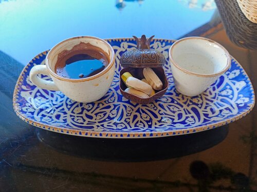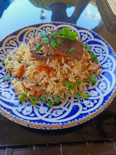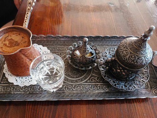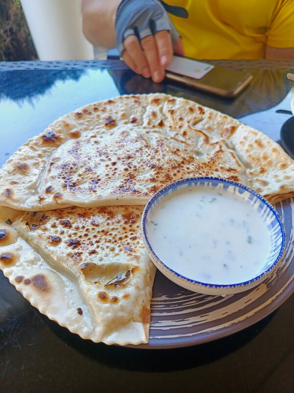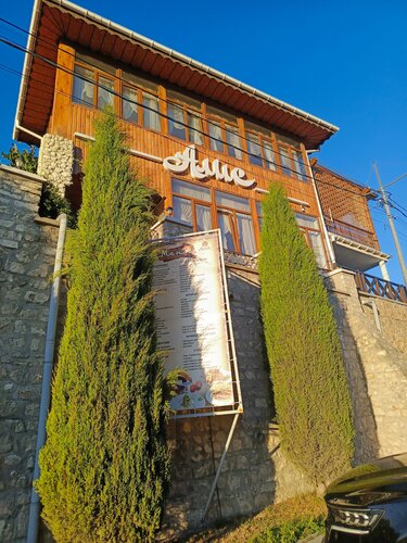 В это кафе нас привезли после экскурсии, пообещав вкусную и недорогую национальную кухню. Но по порядку. Кафе вдоль дороги. Также вдоль дороги имеется парковка. Кафе представляет собой двухэтажное постройку с внутренним двором. Достаточно уютно, но без шика (деревянные столы и лавки для большой компании) Заказ принял официант, которого пришлось долго ждать и это при практически пустом кафе. Теперь о еде. Подача в отличие от еды понравилась больше. Плов принесли теплый с нутом, морковкой, зирой, сверху с кусочками мяса. Не впечатлил. Чебурек с мясом разочаровал как внешним видом, так и начинкой. Тесто влажное и не хрустящее, мясо свалилось в одну сторону и без сока внутри. Попросила пожарить чебурек, а не разогретый приносить, но вторая попытка была не на много лучше. Тесто хрустели при открывании и мясо сразу опять свалилось в угол и сока внутри не было. Есть не стала даже. Попросила унести. Но в чек включили стоимость 1 чебурека. Нареканий не было только к кофе в турке. Вышла с испорченным настроением. Ценник на блюда как везде. Скажу так, для кафе с национальной кухней готовить невкусно стыдно, да ещё туристов возить в такие заведения.