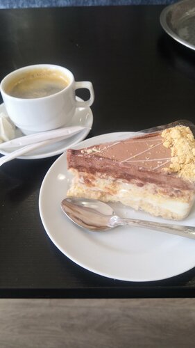 Приехали в Саки и зашли поесть в это заведение под вывеской Кондитерская. Расположено неподалёку от Автовокзала и рынка, почти напротив Администрации через дорогу. Внутри это не совсем кондитерская, но по порядку. Слева от входа зона для взрослых, справа - для гостей с детьми. Салфетки влажные при входе по правую руку. Справа за перегородкой туалеты для всех и для маломобильных. С туалетной бумагой и мылом для рук (чистый). У обычных посетителей есть выбор как сидеть: на обычных стульях, на барных или диванчиках. Есть wi fi - подключается по номеру телефона. В мягкой зоне - на стене большой телевизор. Работает огромный кондиционер. Теперь о еде. Все меню рабочее расположено вверху за зоной обслуживания. Ценник средний. Первые блюда, пельмешка (рекомендую) Много еды и салатов на вес - цена за 100 г. Беляши точно с мясом, такие нигде не купите больше, бомба. Кофе на твёрдую 4. Не автомат, а профи рожковая. Есть как чёрный так и с молоком несколько видов. Американо 100 р. Пироженок много : от эклеров до нескольких разновидностей тортов. Эстерхази и наполеон рекомендую, ещё дубайский чизкей и лавандовое. Вашу еду вам принесёт официант на подносе и когда вы поедите, уберет. Точно рекомендую. Чисто и вкусно.!!! (может быть даже очередь при заказе на кассе)