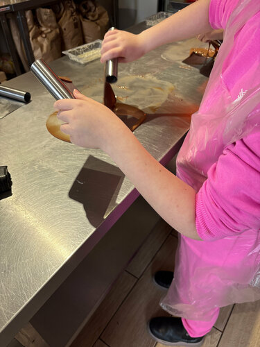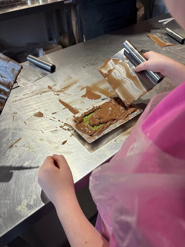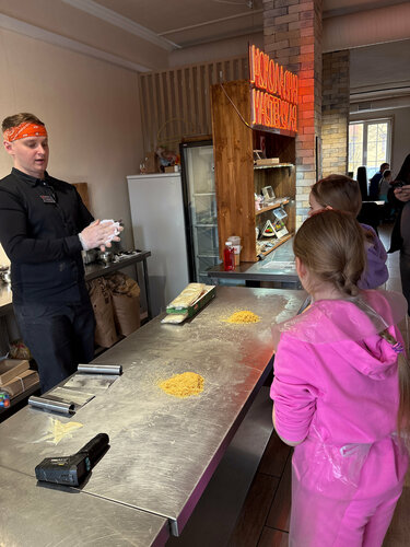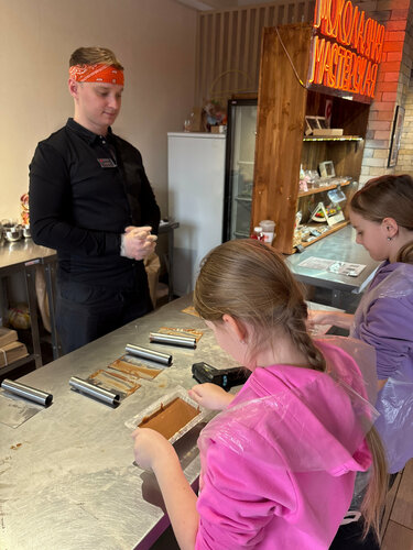 Дочка 9 лет была на мастер классе по изготовлению дубайского шоколада.Очень понравилось,подробно объясняют,все чисто,ребёнок справился.Интересно было всем в ресторане,подходили смотрели,что происходит.В конце мастер класса получили большую плитку шоколада.Очень вкусный))