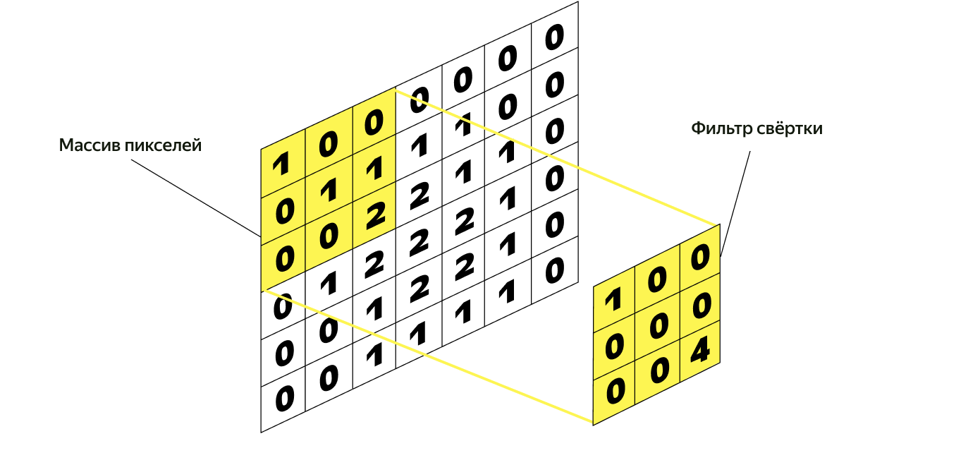 Фильтр свёртки — небольшая квадратная матрица, которая выделяет квадрат такого же размера из всего массива пикселей изображения и «скользит» по изображению. При этом на каждом шаге выполняются математические операции, такие как умножение и суммирование значений пикселей и элементов фильтра, что позволяет выделять важные признаки объекта.