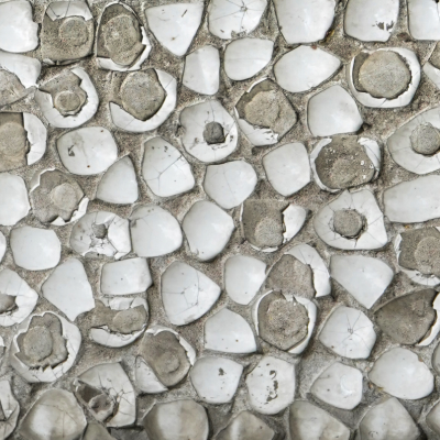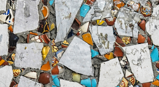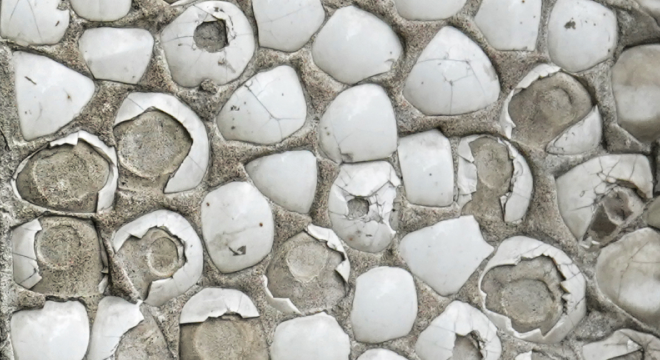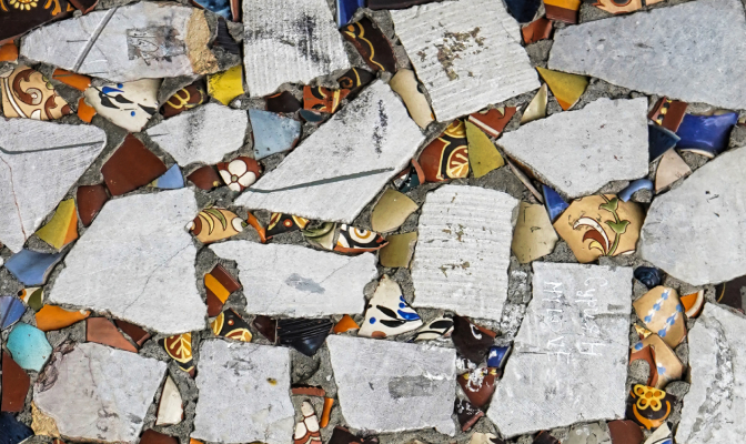 Цветные части мозаики сделаны из фрагментов битой керамической посуды Алматинской фабрики керамики, а белый фон — из фарфоровых пиал Капчагайского завода