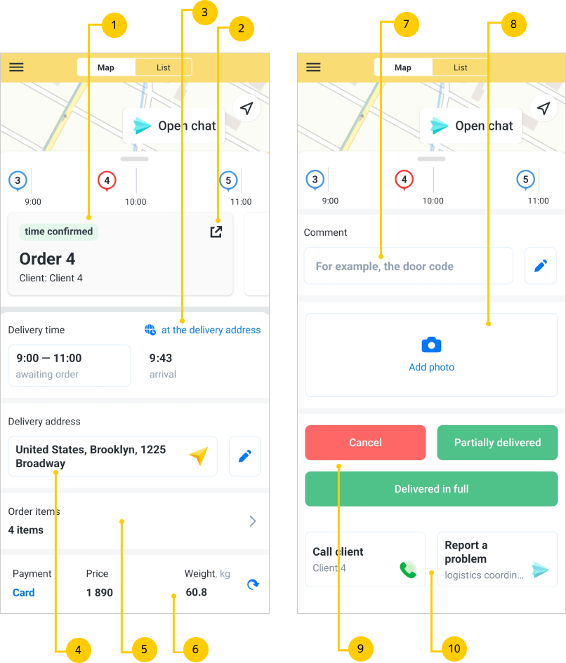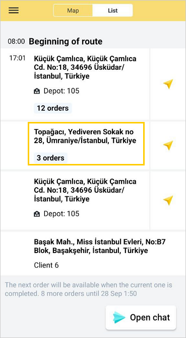 Open the order card. The way to do this depends on how the route is displayed in the app.