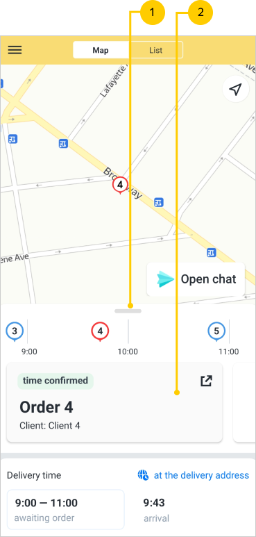 Order ID and client information. Once a route is selected on the map, this information is displayed on preview cards. For more information, see View order.