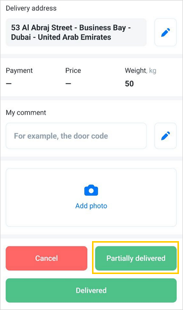 If the order wasn't delivered in full, the courier can set the Partially delivered status in the app and specify the reason. On the dashboard, these orders are marked with the