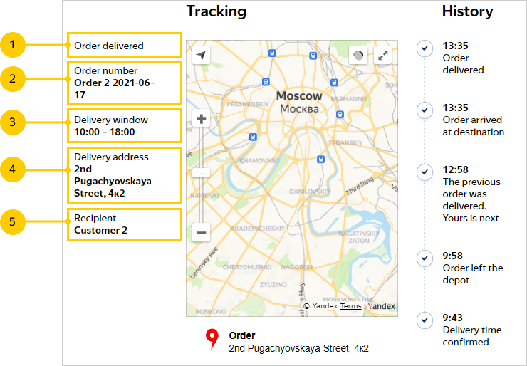 The delivered order widget displays the order and recipient data and the tracking history with significant route points.