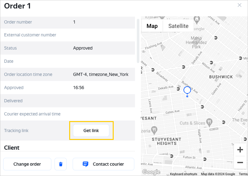 To get a widget link, open the order card and click Get link in the Tracking link field.
