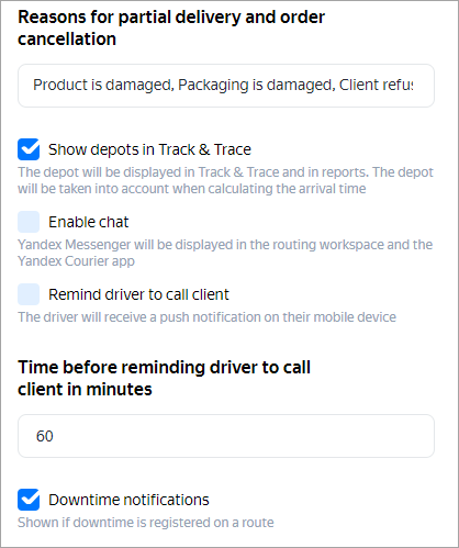 You can specify possible reasons for canceling an order or delivering it partially: couriers will select one that applies from the list. To do this, list the possible reasons in the Reasons for partial delivery and order cancellation field, separating each one with a comma.