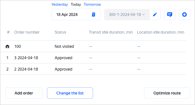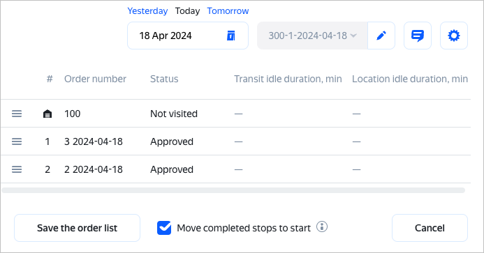 If some orders are canceled or the courier violates the delivery sequence and completes orders from the middle part of the route, you can rearrange the route in accordance with the current status of the orders. In this case, the completed orders will be moved to the beginning of the route, and a new, accurate ETA will be calculated for the remaining orders.