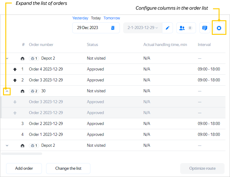 To view the list of orders that are to be picked up from or delivered to a depot, click the arrow. The number of orders is indicated on the icon next to the depot name.