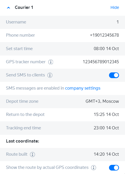While a route is in progress, you can see the time when the courier performed certain key actions: when the route was set, when the courier sent their current coordinates last, and when the courier returned to the depot.