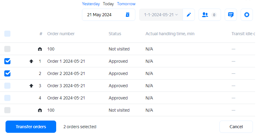 You can only transfer orders to routes of couriers who work on the same day as the original route. Stops at intermediate depots cannot be transferred to another route. Orders associated with intermediate depots can be transferred.