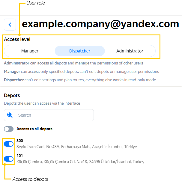 By default, Managers and Dispatchers have access to all orders. To grant access only to orders assigned to a specific depot: