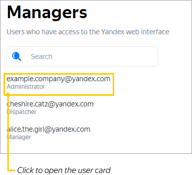 curl -H "Content-Type: application/json" -H "Authorization: OAuth <your-OAuth-token>" -X POST -d '{"login":"alice.the.girl", "role":"manager"}' https://courier.yandex.ru/api/v1/companies/<your-company-id>/usersResult: