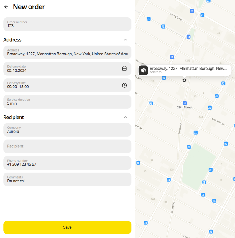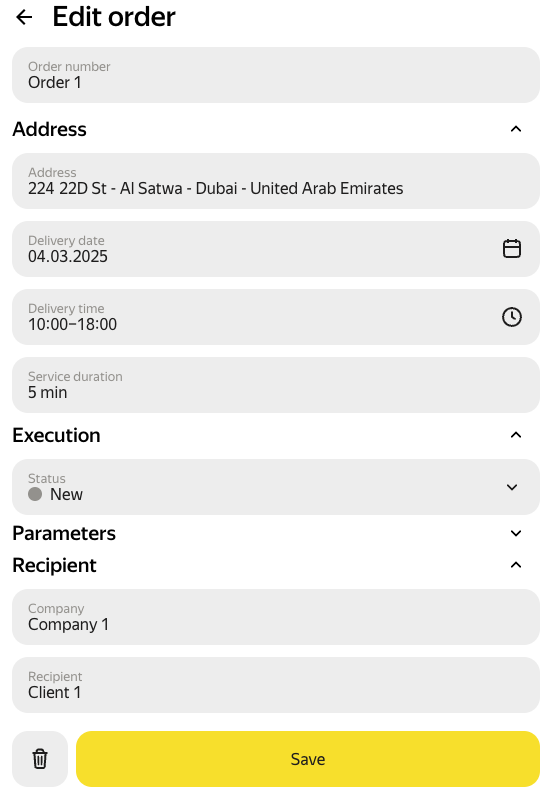 • Editing the values in the Order number, Company, Recipient, Phone number, and Comments fields doesn't affect the route. You can edit these fields without restrictions.