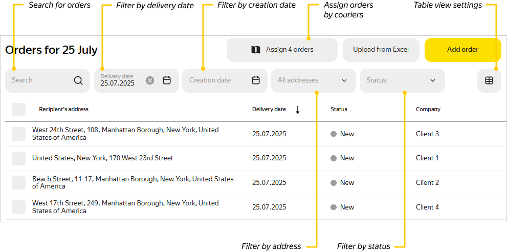 You can sort orders in the table by the Recipient's address, Delivery time, Company, Recipient, and Creation date columns. To do this, click the column name.
