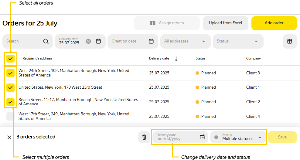 You can distribute filtered orders among couriers using automatic route panning. To do this, click Assign orders. The feature is available only for New orders. For more information about automatic planning, see Route planning.