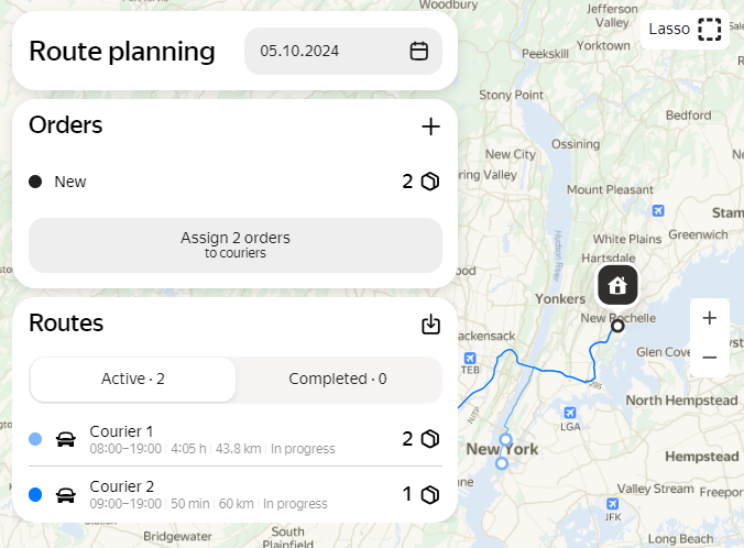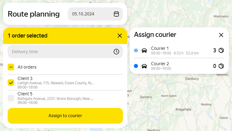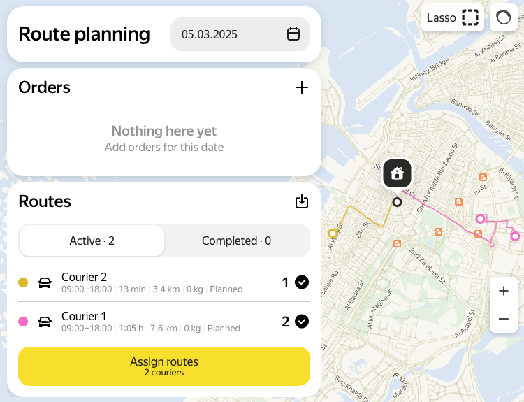 Automatic planning assigns orders to couriers and generates routes based on the following factors: