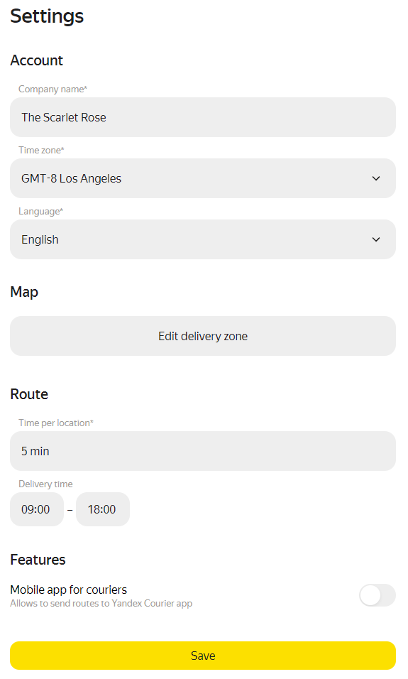 Time per location*: Estimated time that the courier will spend processing orders at each location. This parameter is taken into account when building the route and calculating the total route duration.