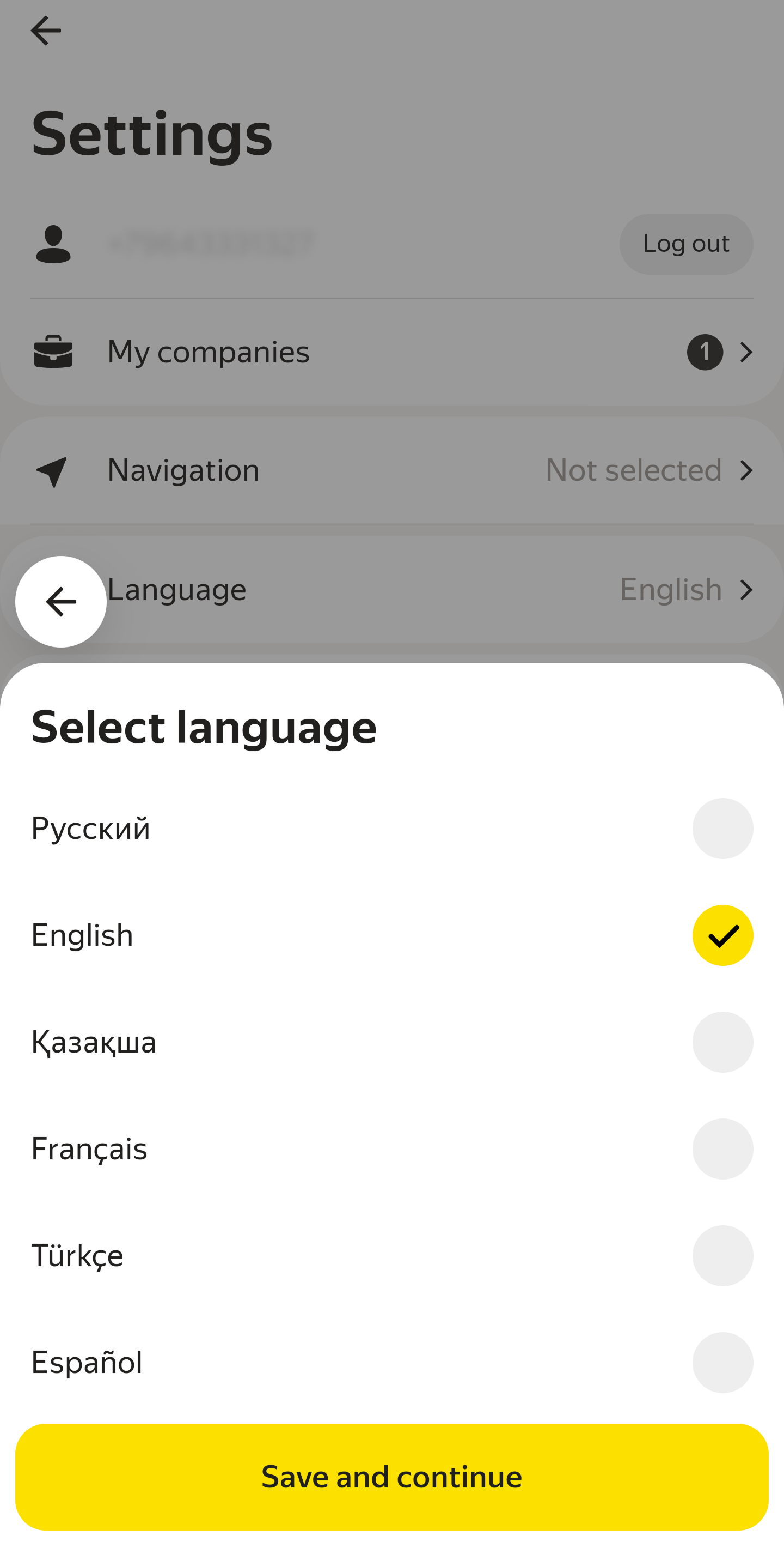 Select your preferred language — Russian, English, Kazakh, French, Turkish, or Spanish.