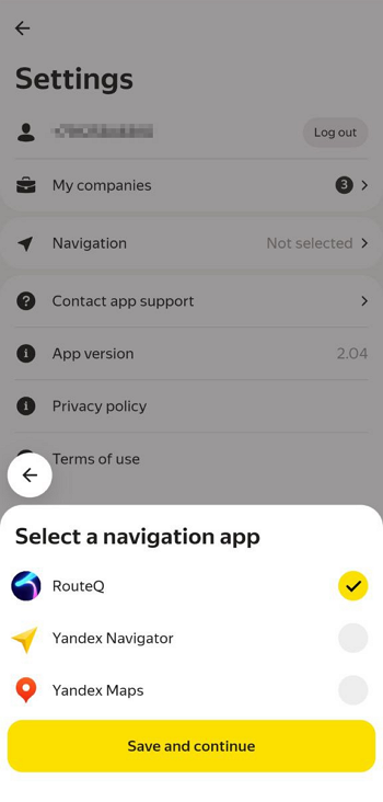Select your preferred navigation system — RouteQ, Yandex Navigator, or Yandex Maps. If you need to save battery and follow the routes as accurately as possible, select RouteQ.
