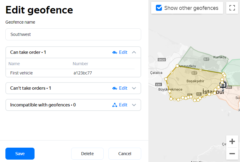 - Delete a geofence. Click Delete and confirm the deletion in the window that opens.