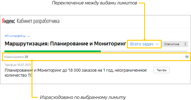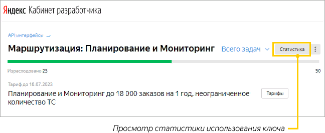 Ключ API можно получить в Кабинете разработчика, и там же доступна статистика использования ключа.