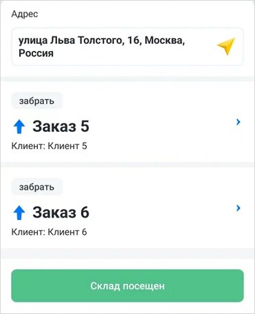 На маршруте может быть запланирован заезд на промежуточный склад, чтобы забрать или выгрузить заказы.