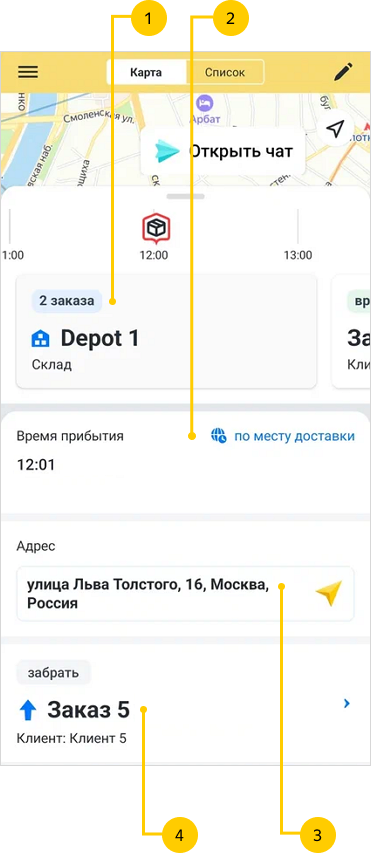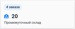 Номер склада и количество заказов, которые нужно забрать или доставить на склад. Если выбран маршрут на карте, эти данные будут на карточках превью (подробнее см. в разделе Просмотреть информацию о складе).