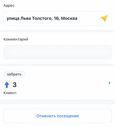 Если нужно отменить посещение склада, откройте его карточку и нажмите Отменить посещение.