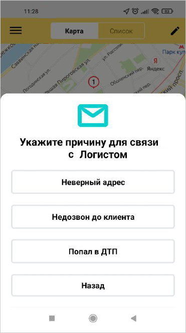 Чтобы отправить преднастроенное сообщение в чат с логистом, курьеру достаточно выбрать в приложении проблему из списка. Сообщение появится в Мессенджере автоматически.