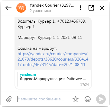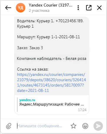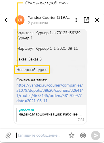 Когда курьер отправляет сообщение логисту, к нему автоматически добавляется информация о маршруте и заказе. Состав такой уточняющей информации зависит от способа, который курьер выбрал для отправки сообщения.