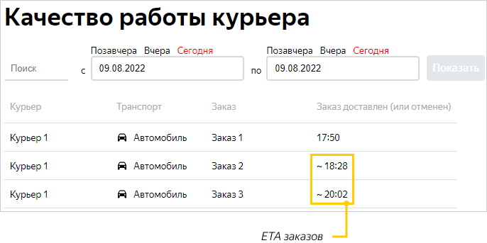 Ожидаемое время прибытия (Estimated Time of Arrival, ETA) — прогноз времени прибытия, который сервис Мониторинга рассчитывает для недоставленных и неотмененных заказов на маршруте каждые несколько минут. При составлении прогноза учитываются текущие данные о пробках и загруженности дорог.
