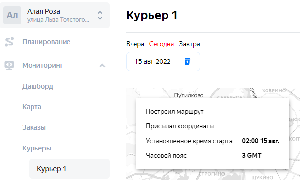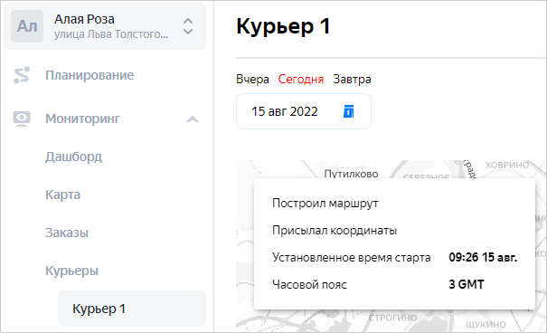 Маршрут отслеживается между параметрами route_start и route_finish. Полученный трек движения курьера и время прохождения контрольных точек маршрута вы найдете в интерфейсе (подробнее см. в разделах Местонахождение курьера в определенное время и Информация о работе курьера).