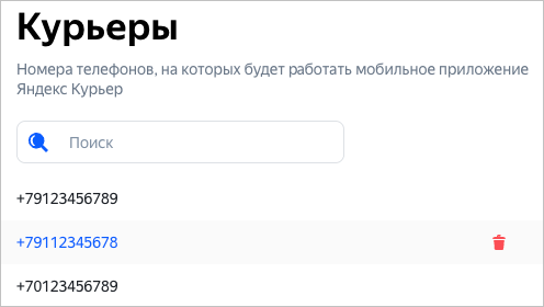 В этом разделе вы можете добавить номера телефонов курьеров, которым нужно работать с приложением Яндекс Маршрутизация.
