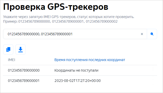 В разделе GPS-трекеры вы можете проверить статус GPS-трекеров. Для этого введите их IMEI через запятую и нажмите . Если координаты с трекера поступали, то в отчете отображается дата и время последней присланной координаты.