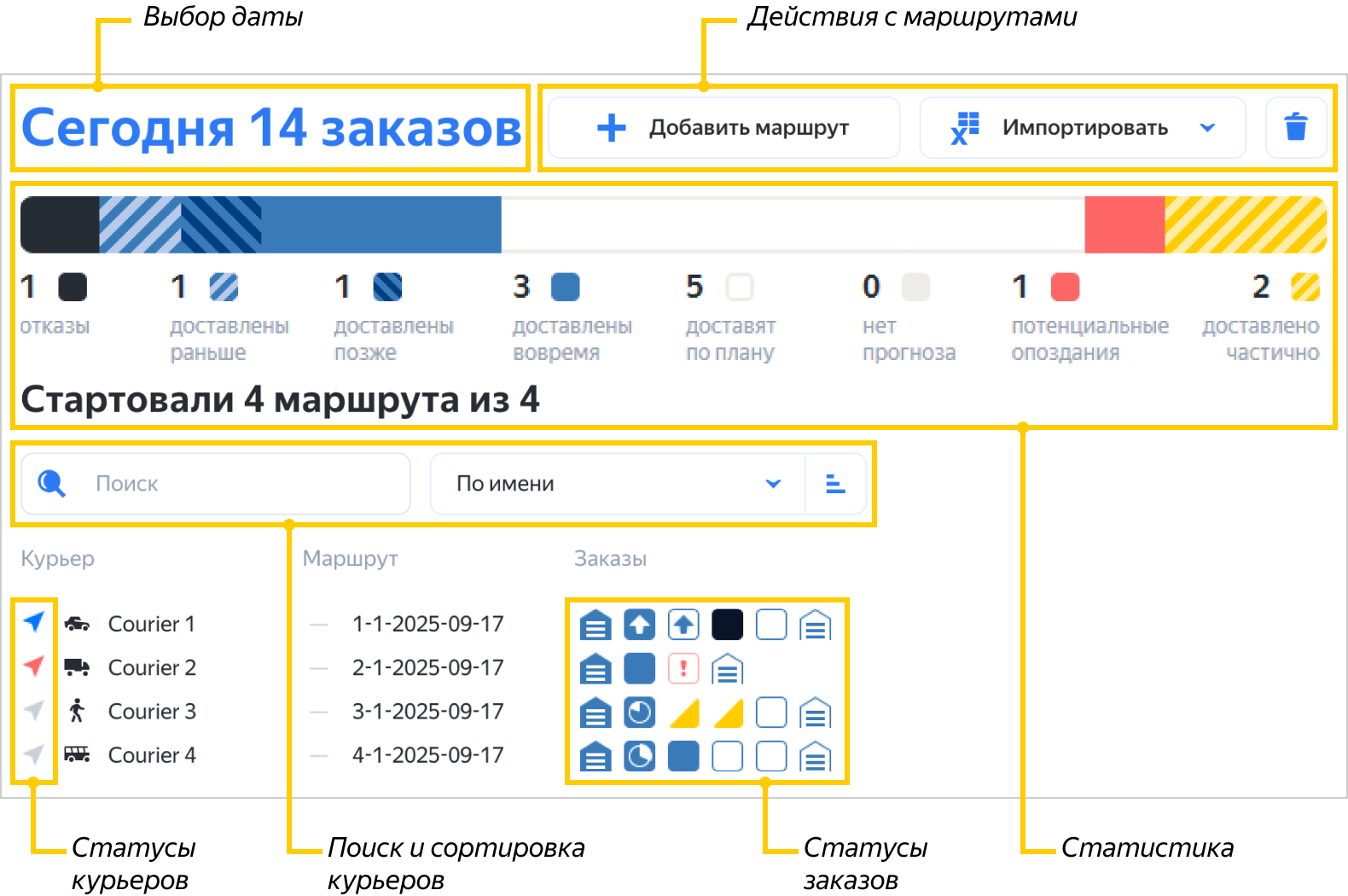Статусы доставки обозначены цветом, статусы проблем со временем доставки — знаками «!» и «?», а типы точек — значками.