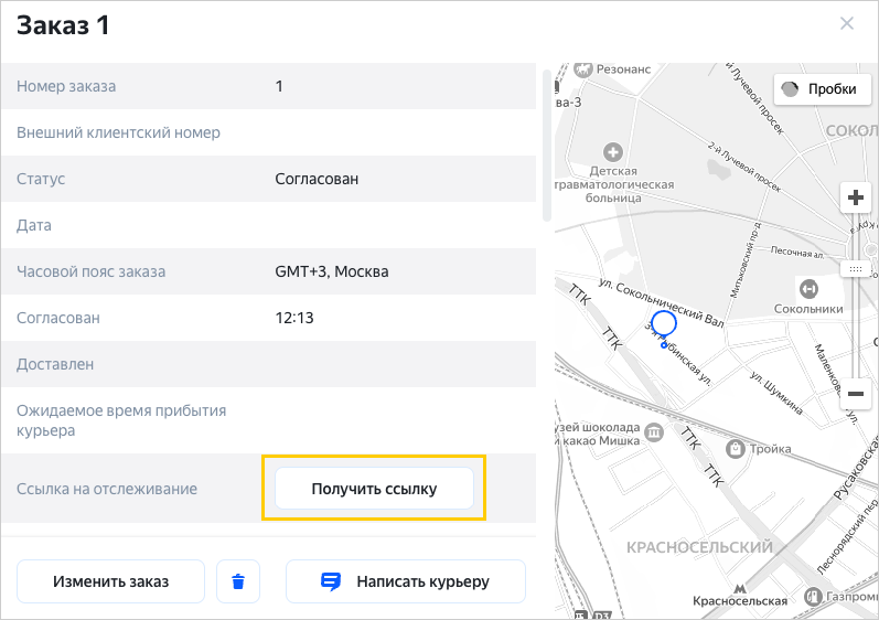 Чтобы посмотреть маршрут, в рамках которого выполняется доставка, нажмите ссылку в поле Курьер.