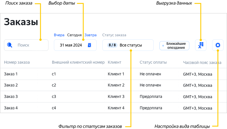 Чтобы отобразить в таблице только заказы, которые должны быть доставлены в ближайшее время и по которым ожидаются опоздания, нажмите кнопку Ближайшие опоздания. Чтобы сбросить фильтр, нажмите на кнопку еще раз.