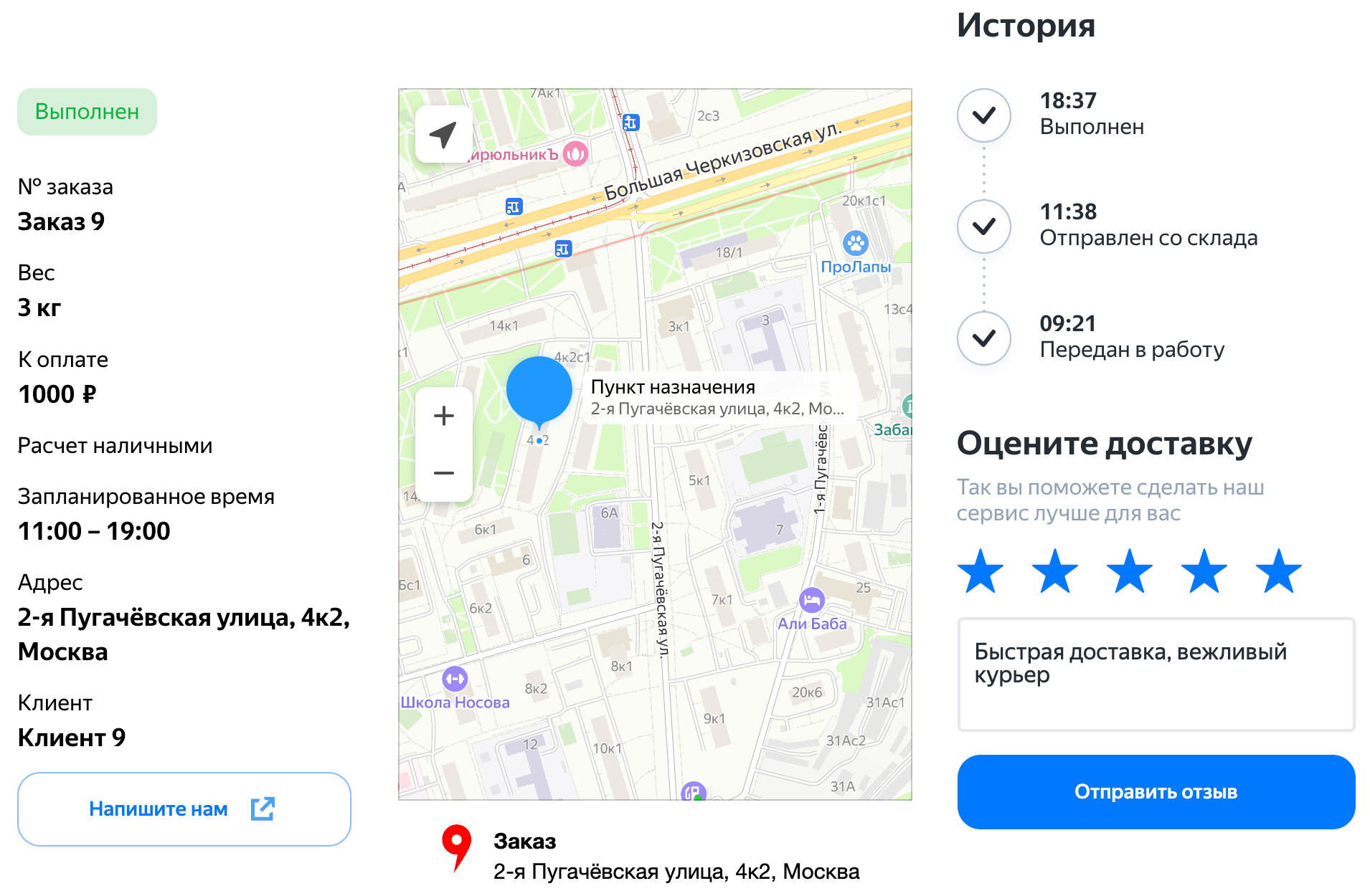 При выезде курьера со склада или за определенное время до приезда курьера на заказ (например, за 30 минут) клиенту отправляется SMS-уведомление. Если опция оценки доставки подключена, в SMS добавляется ссылка на страницу, где можно поставить оценку и написать отзыв. Чтобы изменить оценку или отзыв, нужно повторно перейти по ссылке. В системе отображается последняя оценка и последний комментарий по каждому заказу.