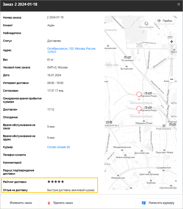 Оценки и отзывы по заказам можно посмотреть в отчете Качество работы курьера и выгрузить в Excel.