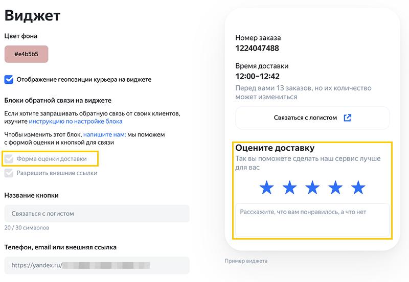 Вы можете дополнить виджет возможностью оценить доставку и написать комментарий. Опция доступна с дополнительной тарификацией. Для подключения опции обратитесь в службу поддержки.