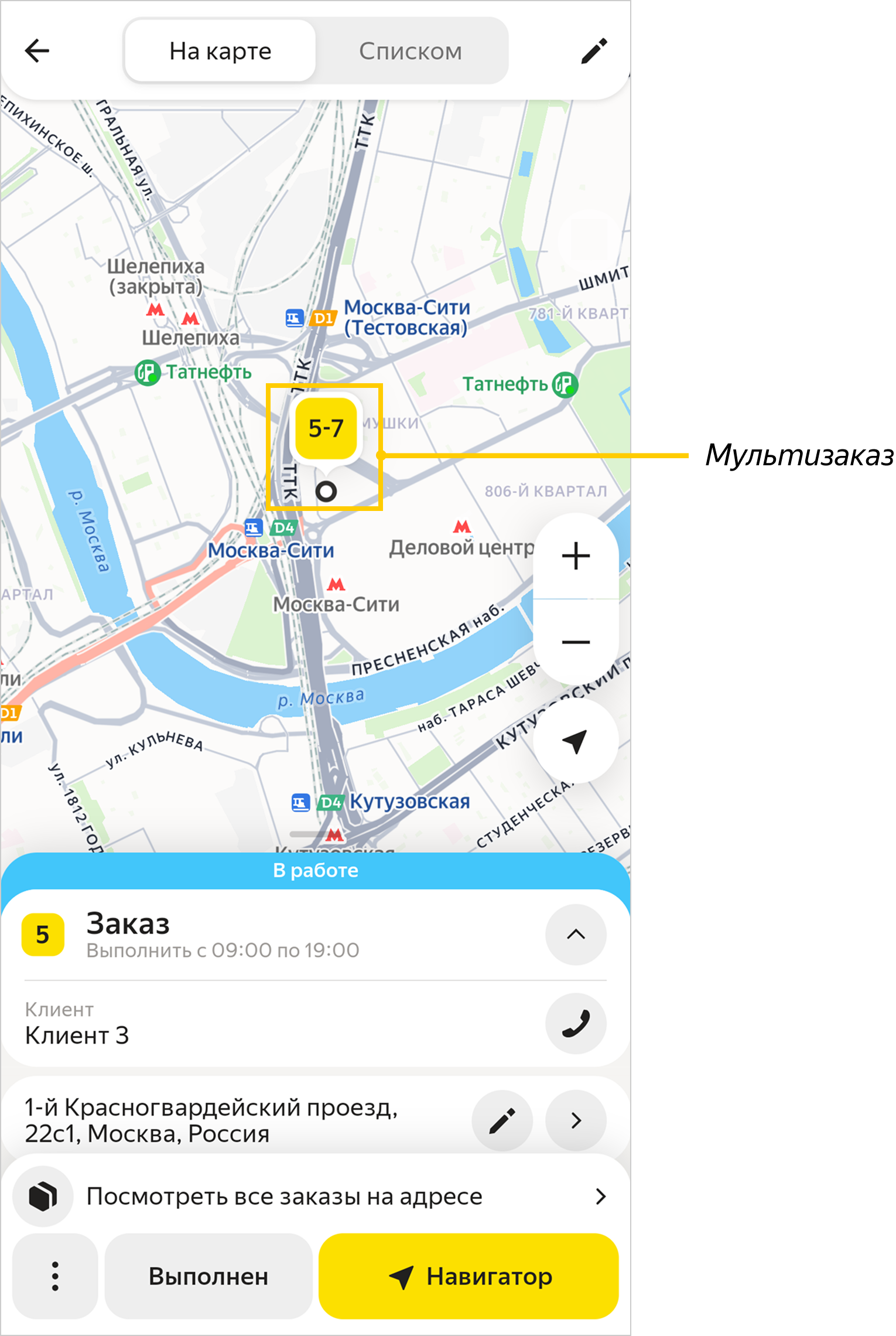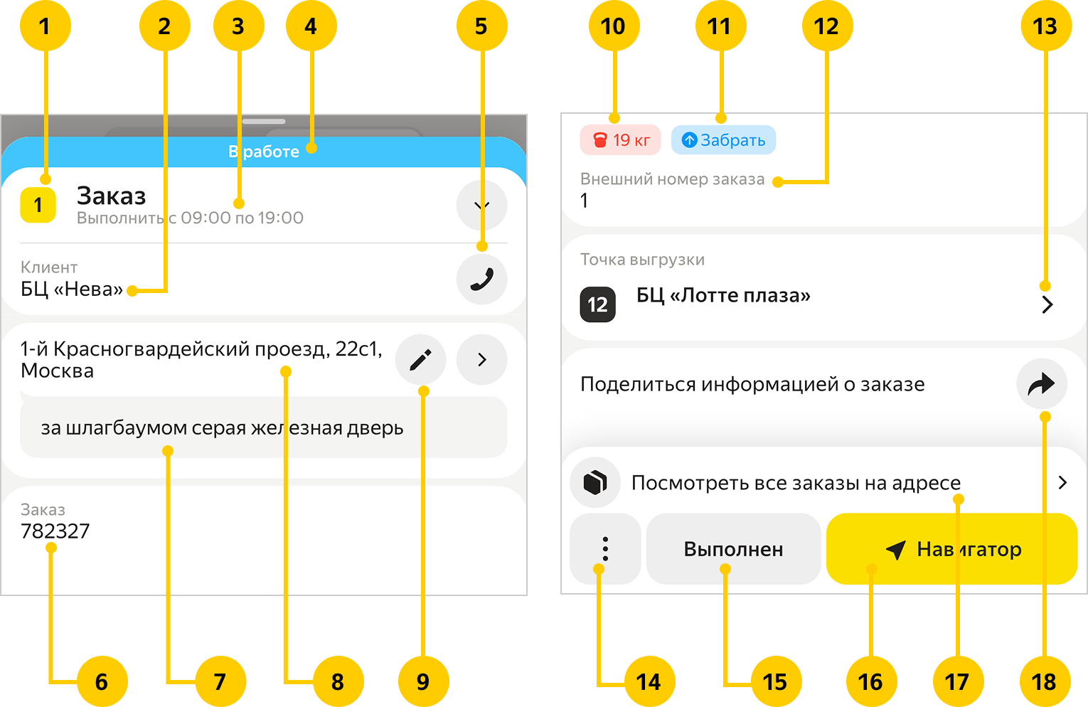 22. Навигатор түймесі, ол Яндекс Навигатор, Яндекс Карты қолданбаларында немесе ішкі навигация жүйесінде тапсырысқа дейінгі маршрут құруға арналған.