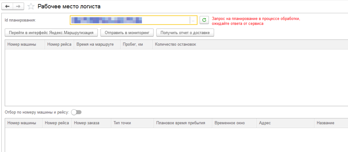 Для просмотра результатов перейдите на вкладку Результат планирования. По умолчанию отображается последний оправленный запрос. Чтобы найти запрос, в поле id планирования укажите