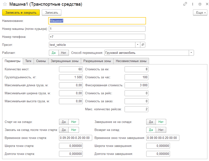 Справочник Машины должен иметь хотя бы один непомеченный на удаление элемент с заполненными параметрами. Для настройки также можно использовать пресеты. Пример заполнения показан на изображении ниже: