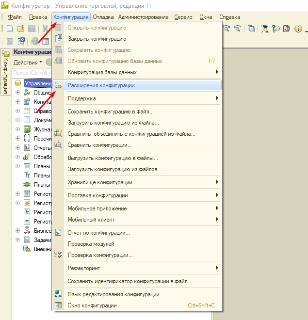 Для установки расширения нужно запустить 1С в режиме конфигуратора и открыть список расширений. Для этого нужно запустить пункт меню Конфигурация и выбрать там подпункт Расширения конфигурации.