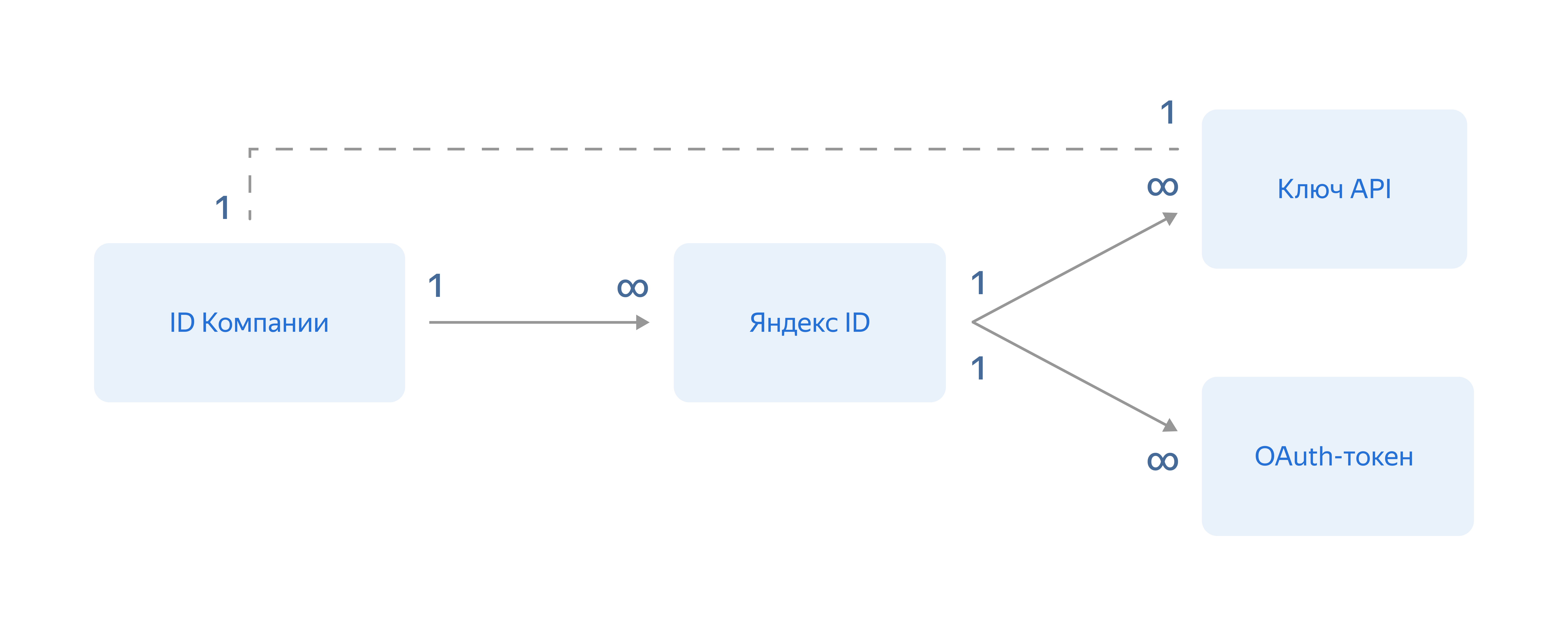 Для получения доступа учетная запись или Яндекс ID должны быть привязана к определенному ID компании. Учетная запись может быть привязана только к одной компании, но компания может содержать несколько учетных записей. Если ID компании уже существует, то добавить новых пользователей может администратор компании. Если создать новую компанию, то учетная запись, под которой был авторизован пользователь при создании компании, будет добавлена в качестве администратора.