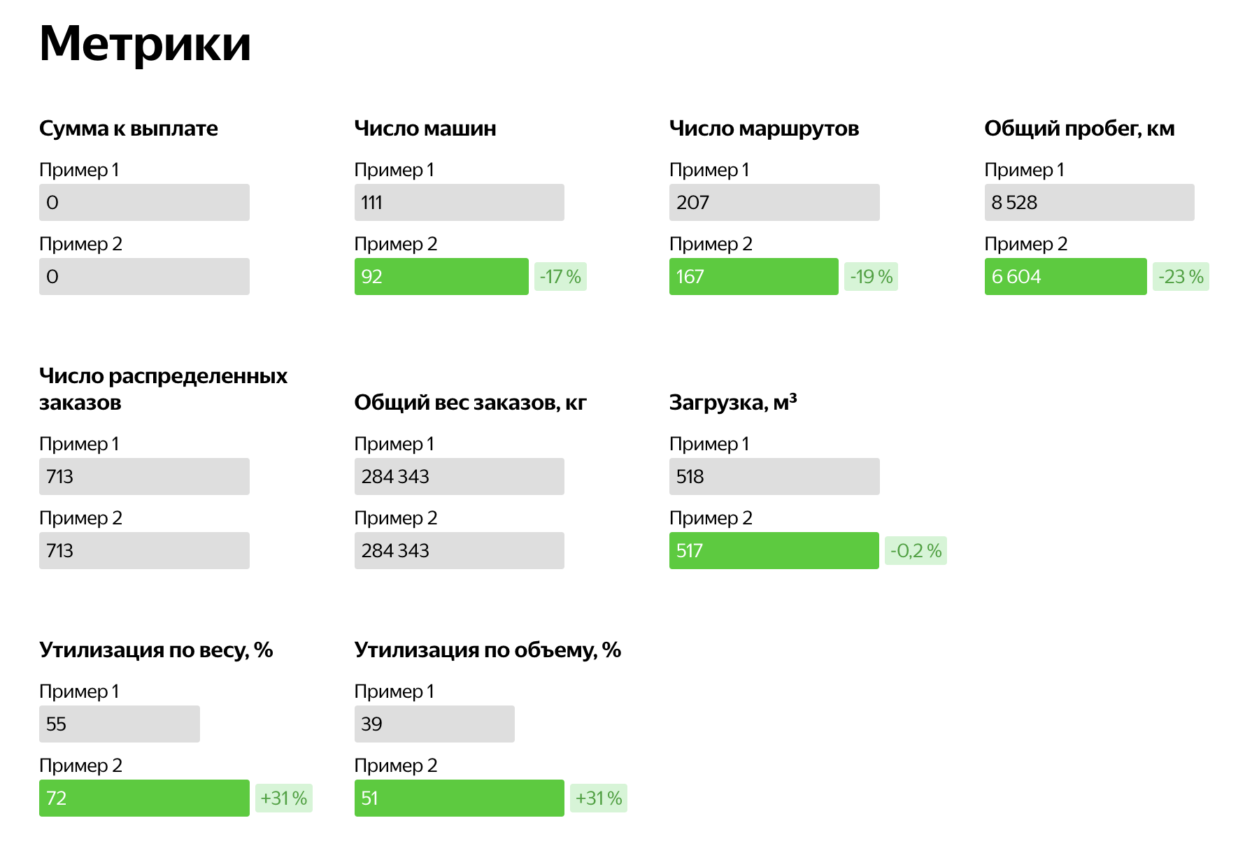 Автоматическое планирование сократило количество автомобилей и число маршрутов на 6%, устранило нарушения по вместимости и тегам. Меньше автомобилей — ниже расходы на доставку.