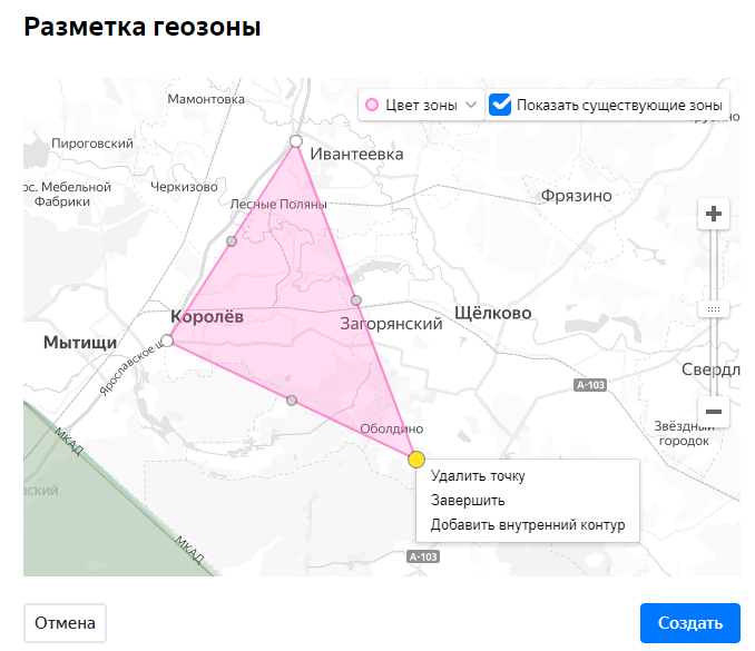 - Чтобы видеть на карте созданные ранее зоны, отметьте Показать существующие зоны в правом верхнем углу.